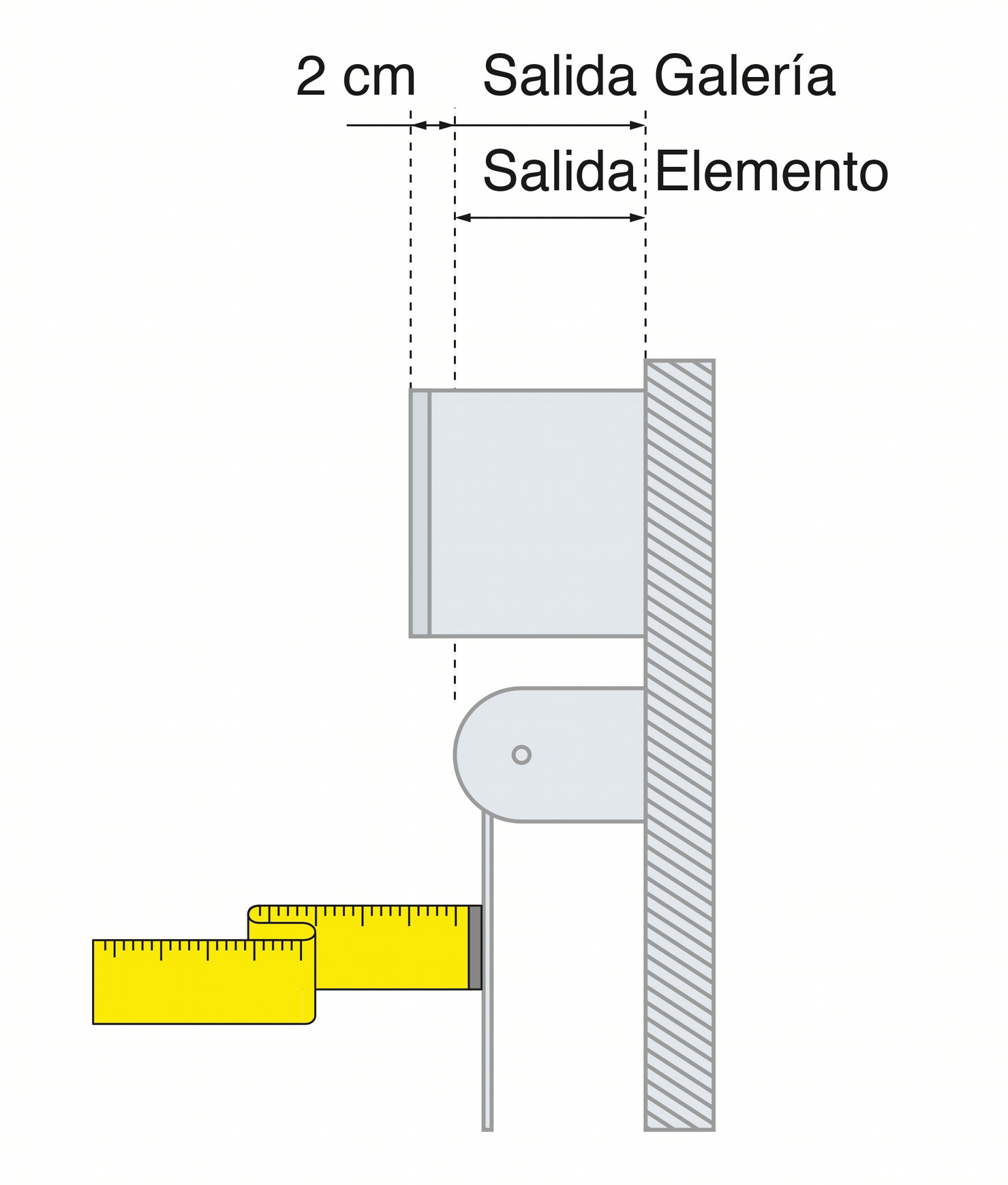 Para medir la vuelta (o salida) de nuestra galería también deberemos tener en cuenta el elemento que queremos cubir. En este caso hay que sumar 2 cm a la distancia que sobresale de la pared. De este modo, conservaremos cierta holgura para poder maniobrar en su interior.
